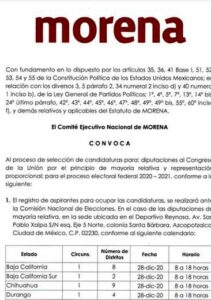 CIUDAD DE MÉXICO, 26 diciembre 2020/.- El Movimiento Regeneración Nacional (MORENA) publicó la convocatoria para elegir a los candidatos a diputados federales.