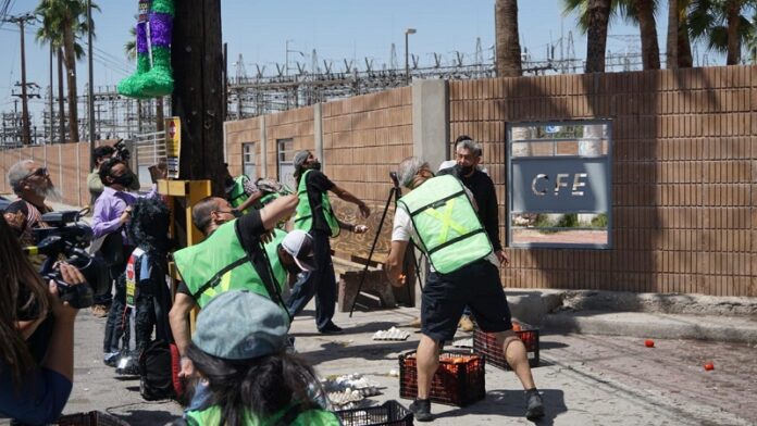 En la protesta encabezada por Sergio Tamai Quintero, también quemaron 2 piñatas, una de ellas con el nombre del titular de la CFE, Manuel Bartlett y una más que representó a los funcionarios “insensibles”.
