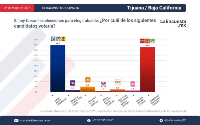 TIJUANA.BAJA CALIFORNIA, 26 MAYO 2021/ Con 44.8 por ciento en la preferencias electorales, Jorge Ramos Hernández, está arriba en las encuestas para la alcaldía de Tijuana, la Candidata de Morena está abajo, con 42.9 por ciento.