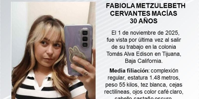 Fabiola Metzulebeth Cervantes, de 30 años de edad, desapareció el pasado 3 de noviembre en Tijuana, piden a la Fiscalía General de Baja California (FGE), agilizar la investigación para dar con su paradero, pues van 12 días sin saber qué pasó con ella.