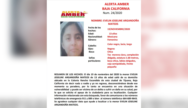 De acuerdo al reporte, el 19 de noviembre de 2020 la menor  Evelin Joseline Argandoña Mateos, salió de su domicilio ubicado en la colonia Rancho Escondido  en la ciudad de Tijuana, y ya no regreso, desconociéndose desde ese momento su paradero.