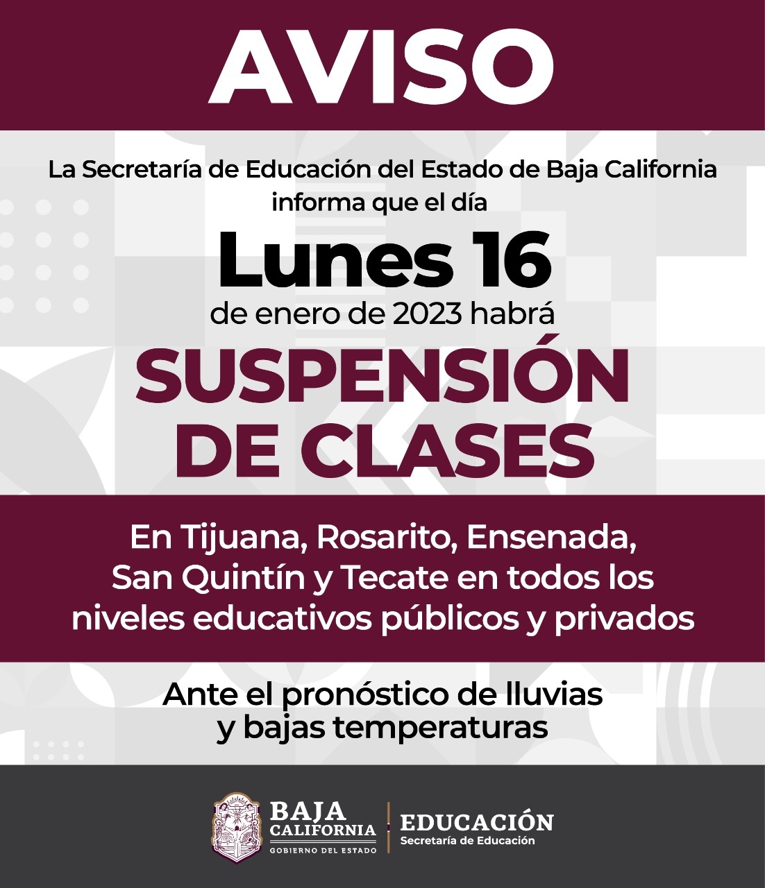 Tanto las escuelas del sector privado, como del público, y de todos los niveles, suspenderán clases este lunes, con el fin de disminuir la movilidad en dichos municipios, y así reducir la exposición al riesgo que implica el pronóstico de lluvia en la zona costa, las bajas temperaturas, así como la posibilidad de una nevada o aguanieve en la sierra de Baja California.