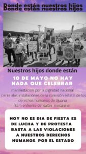 «No es un 10 de mayo festivo, no hay nada qué celebrar; mientras muchas madres se despiertan con sus hijos a su lado, el mío lleva dos años desaparecido y la Fiscalía no hace nada, él era un joven de trabajo, se fue a trabajar al estadio de fútbol y ya no volvió», dijo la señora Claudia Iveth Chávez.