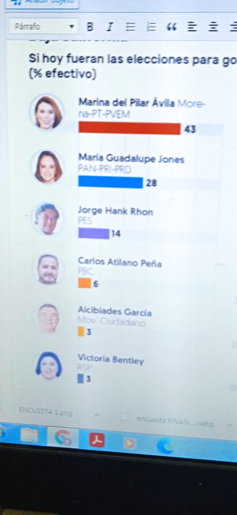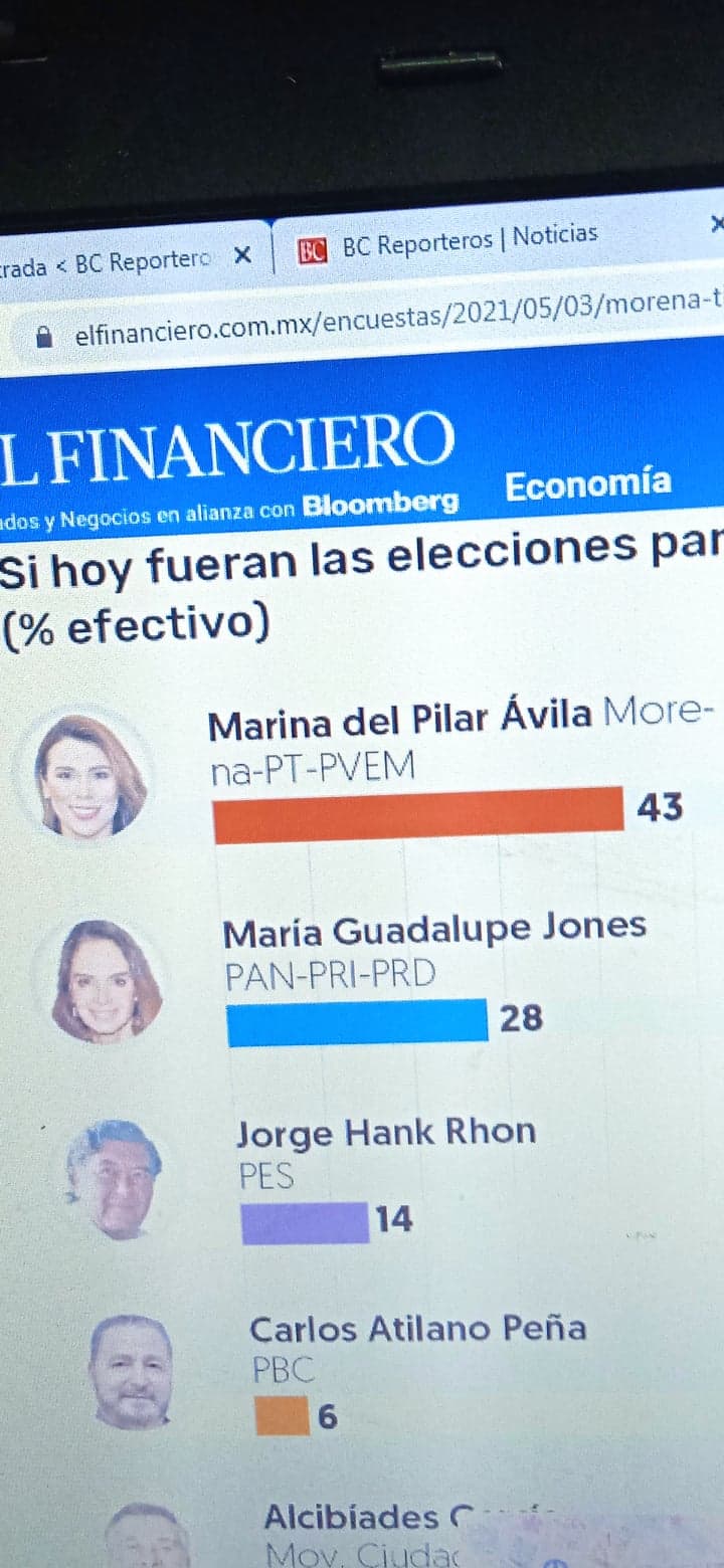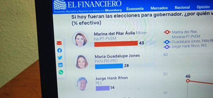 De acuerdo con la más reciente encuesta de El Financiero, la morenista Marina del Pilar Ávila tiene el 43 por ciento de las preferencias, mientras que su rival más cercana, María Guadalupe Jones, de la alianza PAN-PRI-PRD, cayó del 33 al 28 por ciento.