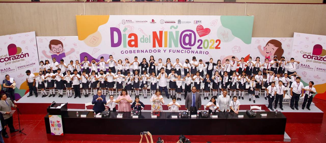 MEXICALI,BAJA CALIFORNIA.- Para reconocer la importancia de niñas y los niños y sus sentimientos y opiniones, así como la necesidad de garantizar su derecho a ser felices y tener bienestar, la Gobernadora de Baja California, Marina del Pilar Avila Olmeda, y el Niño Gobernador de Baja California, Santiago Pérez González, encabezaron el evento oficial del “Día de la Niña y el Niño 2022”