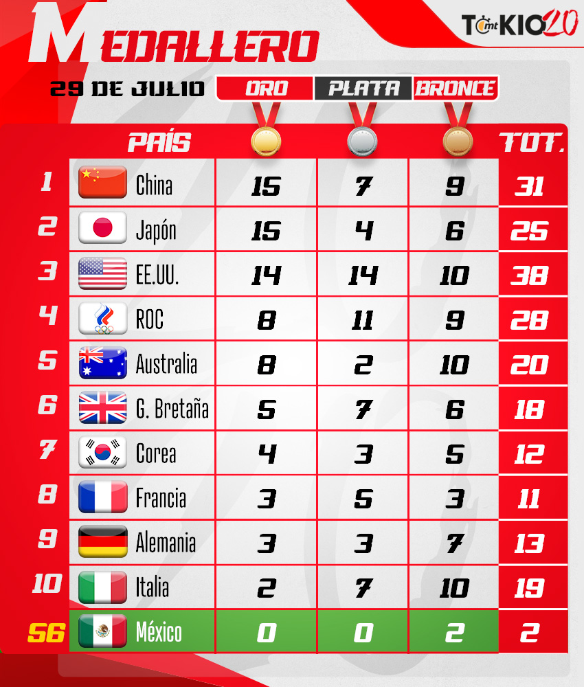 MEDALLERO OLIMPICO, TOKIO 2020.Del 23 de julio al 8 de agosto 2021
