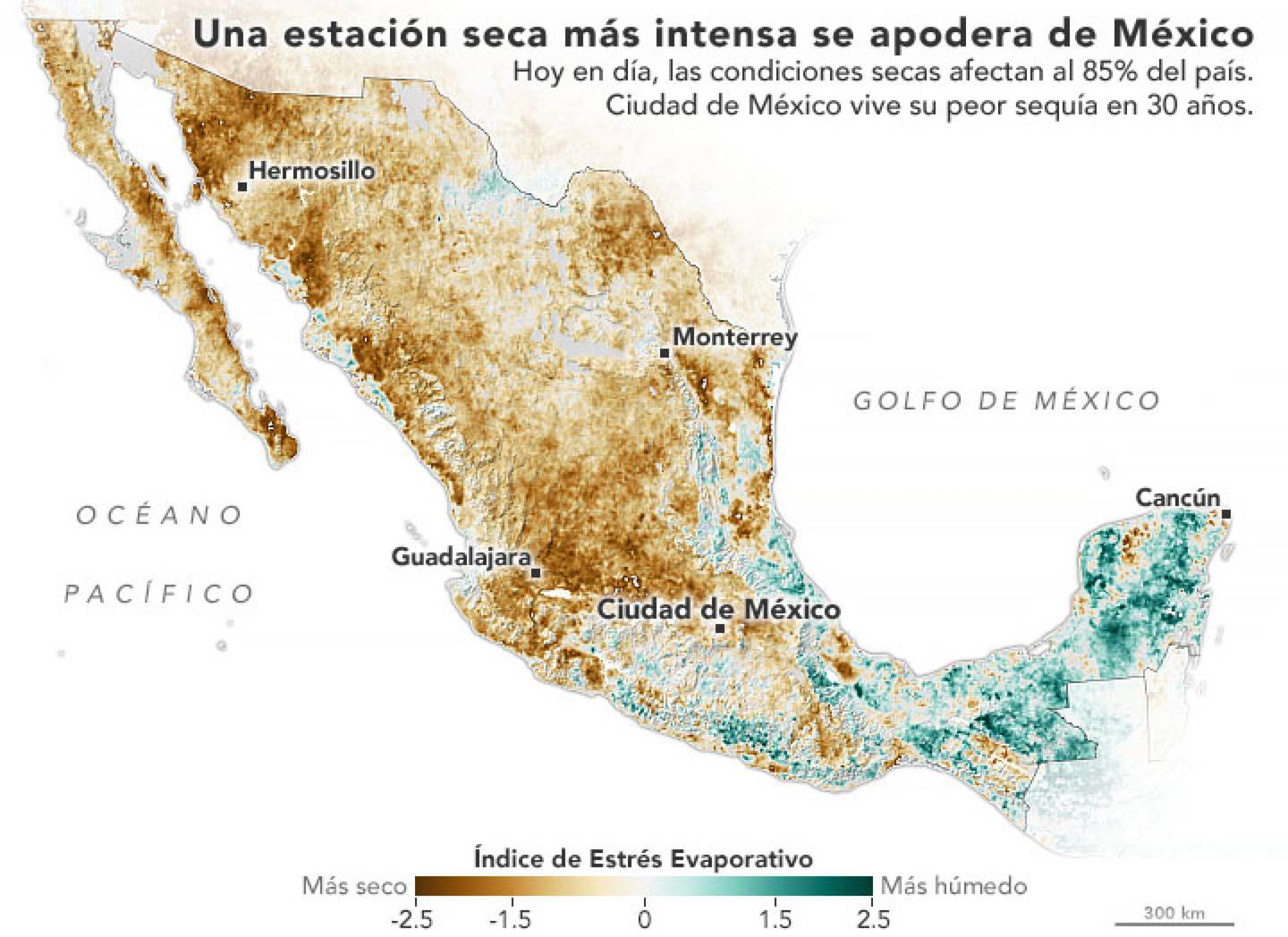 El 85 por ciento del país enfrenta condiciones de sequía, de acuerdo con un registro con corte hasta el 15 de abril. “Grandes presas en todo México se encuentran en niveles excepcionalmente bajos, lo que agota los recursos hídricos para beber, cultivar y regar”, apunta la NASA, que recordó que la jefa de Gobierno de la Ciudad de México, Claudia Sheinbaum, calificó la situación como la peor sequía en 30 años para la ciudad detallando que el problema puede verse en los embalses que almacenan agua de otros estados para abastecer la capital del país.