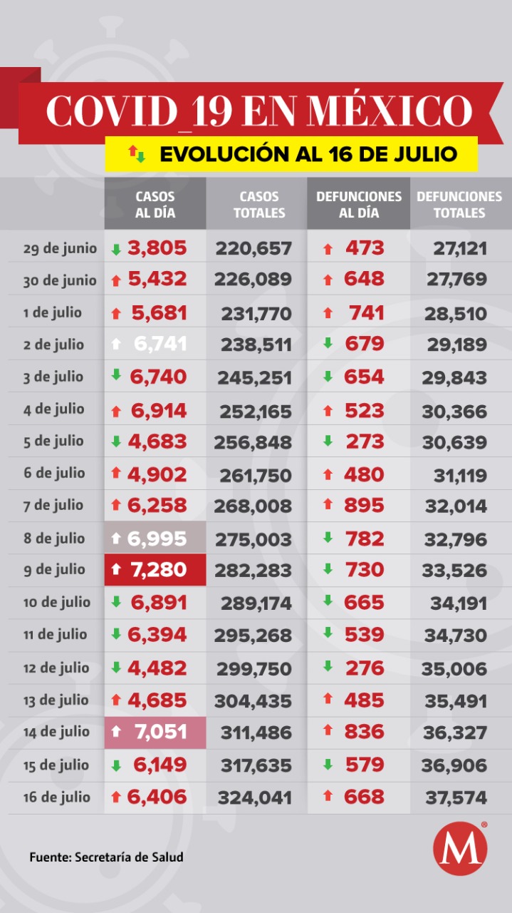 La Secretaría de Salud informó el domingo que el país registró 35 mil 006 muertos, con lo que superó a Italia en el número de personas fallecidas. Asimismo, se registraron 299 mil 750 casos confirmados y 29 mil 839 casos activos.