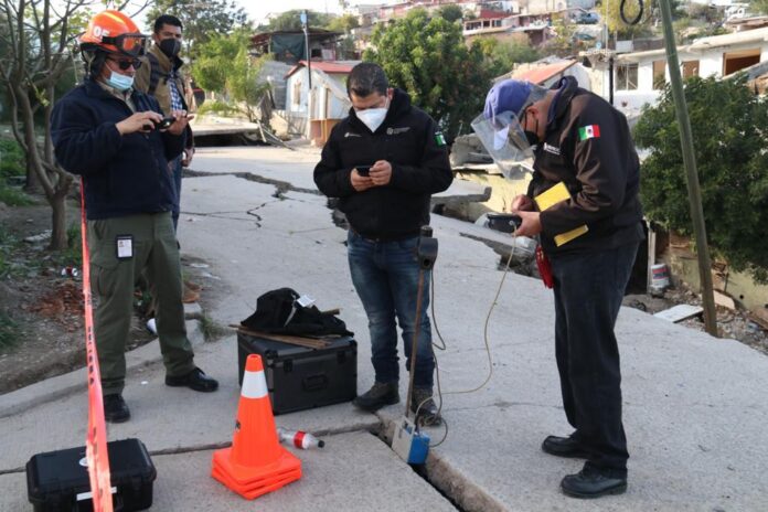 Tijuana, Baja California, a 6 de febrero de 2021.- El XXIII Ayuntamiento de Tijuana, trabajó en coordinación con el Centro Nacional de Prevención de Desastres (Cenapred) y autoridades estatales, para realizar sobrevuelos con un dron en la zona del deslizamiento de tierra de la colonia 3 de Octubre, a fin de continuar los monitoreos y constatar el daño.