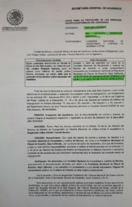 En su solicitud la quejosa pide que el expediente se turne al magistrado Felipe Alfredo Fuentes Barrera, y remitir copia a cada una de las partes involucradas como lo establecen los artículos 17 y 18 de la Ley General de Medios de Impugnación en Materia Electoral.