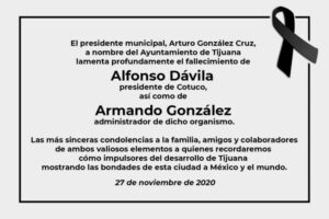 Tijuana, 27 de noviembre2020- El presidente del Comité de Turismo y Convenciones (Cotuco) de Tijuana, Alfonso Dávila, falleció a causa de coronavirus, la tarde de este viernes,al igual que el administrador de dicho organismo.