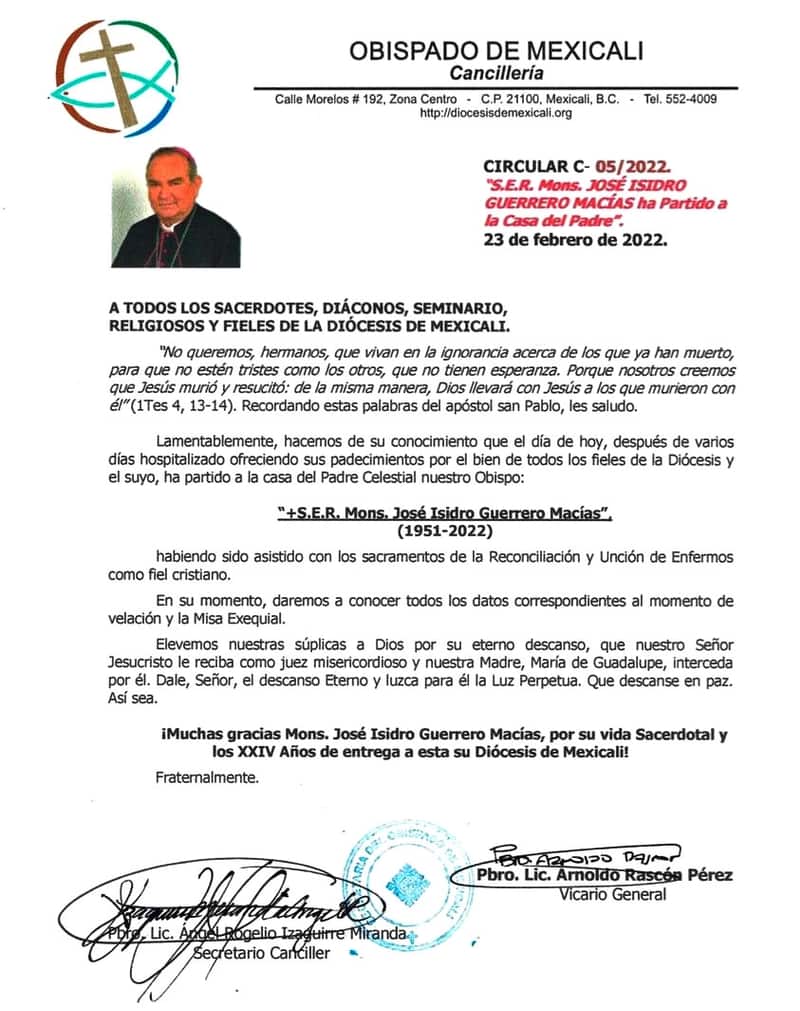 Fue durante la mañana del miércoles 23 de febrero de 2022 cuando la Diócesis de Mexicali confirmó la noticia del fallecimiento de José Isidro Guerrero Macías, que durante 25 años sirvió como Obispo de Mexicali.
