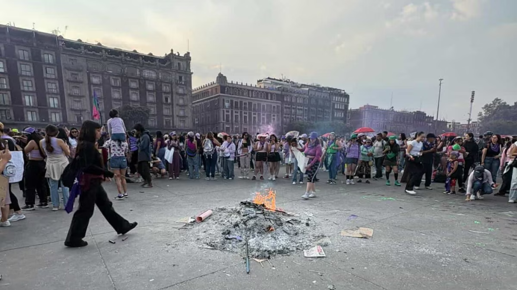 La protesta también se desarrolla nuevamente con edificios del Centro Histórico protegidos por vallas metálicas, una medida aplicada en los últimos años durante las marchas feministas con el argumento oficial de resguardar inmuebles históricos.