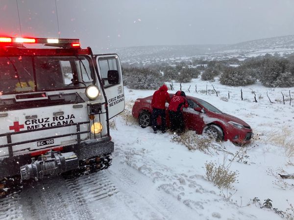 Elementos de la Cruz Roja Mexicana asignados a la zona de La Rumorosa, realizaron el rescate de cerca de diez personas que habían quedado varadas en un taxi a causa de las nevadas que se registraron este día.