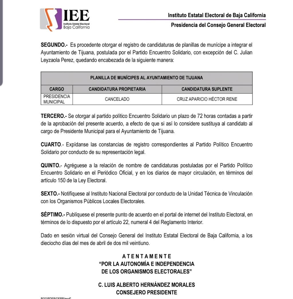 De acuerdo al proyecto de Punto de Acuerdo del Consejo General del IEE sobre las solicitudes de registro de los aspirantes a munícipes del PES, se rechaza la postulación del ex Secretario de Seguridad Pública de Tijuana y dos veces candidato a la alcaldía, por lo que el organismo electoral otorgó «un plazo de 72 horas contadas a partir de la aprobación del presente acuerdo, a efecto de que si así lo considere sustituya al candidato al cargo de Presidente Municipal para el Ayuntamiento de Tijuana».