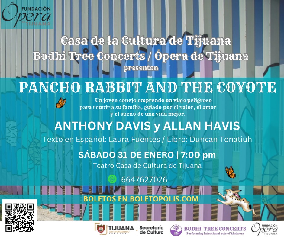 Tijuana, Baja California,26 de enero de 2026 Ópera de Tijuana se prepara para iniciar su Temporada 2026 con la puesta en escena de “Pancho Rabbit and the Coyote”, una ópera bilingüe (español e inglés) para toda la familia. La función se realizará el sábado 31 de enero a las 7:00 PM en la Casa de la Cultura de Tijuana.