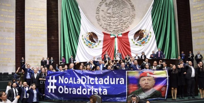 En sesión ordinaria de este martes, diputados del Partido Acción Nacional (PAN)tomaron la tribuna del Palacio Legislativo de San Lázaro con pancartas de #NoALaDictaduraObradorista.