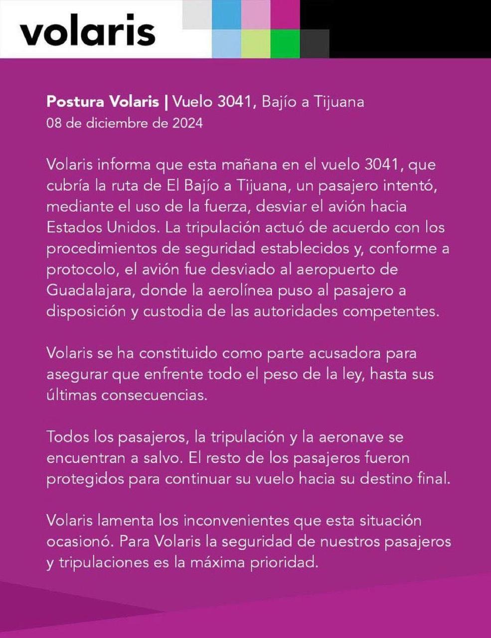 “Volaris informa que esta mañana, en el vuelo 3041 que cubría la ruta de El Bajío a Tijuana, un pasajero intentó, mediante el uso de la fuerza, desviar el avión hacia Estados Unidos. La tripulación actuó de acuerdo con los procedimientos de seguridad establecidos y conforme a protocolo”, reza el escrito divulgado en X.