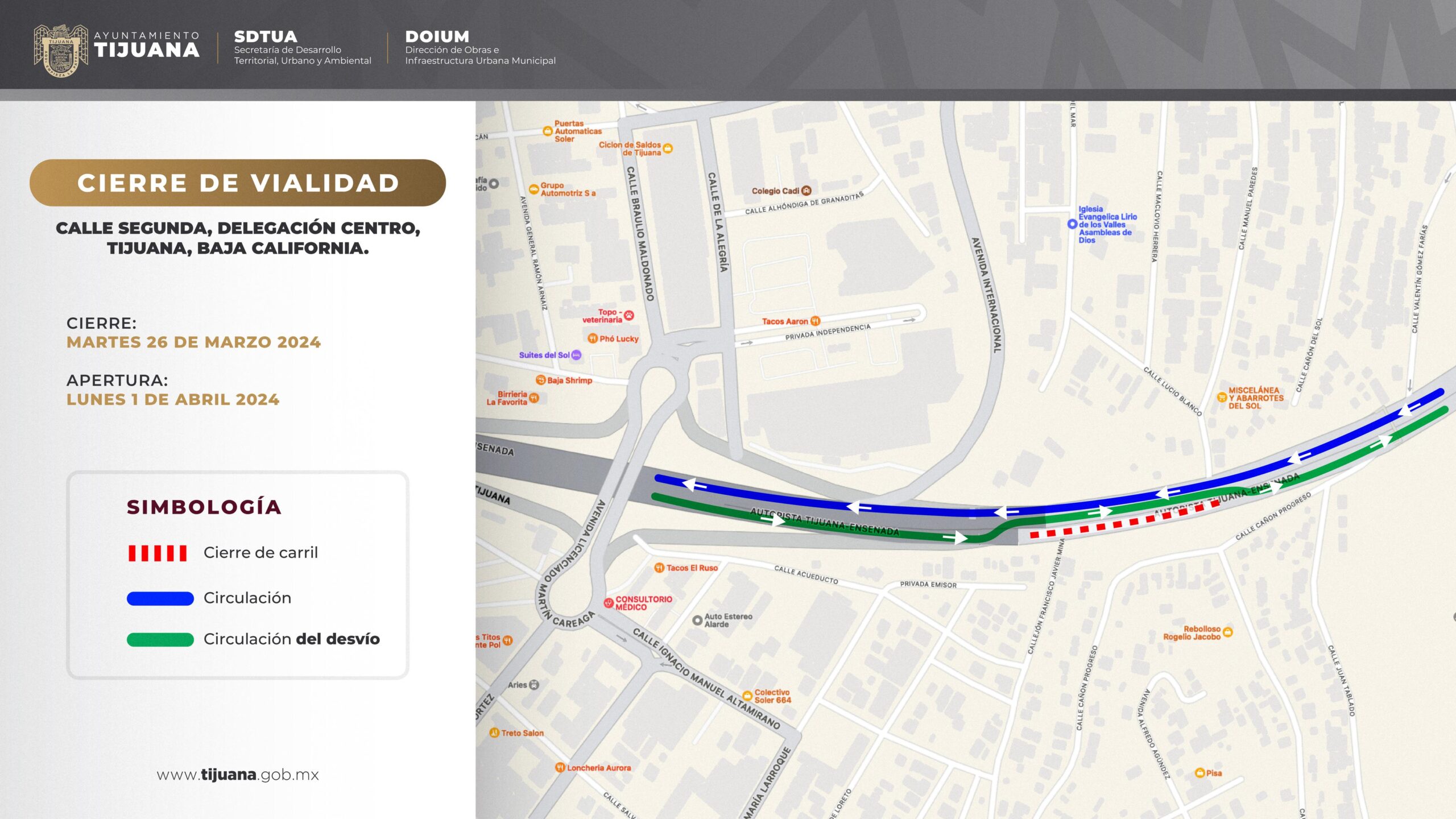 Tijuana, Baja California, a 24 de marzo de 2024.- El Ayuntamiento de Tijuana en su actividad de adecuación de vialidades, realizará una obra de reparación sobre la calle segunda a la altura del callejón Francisco Javier Mina, a partir de la colonia Soler hacia la zona centro, desde el martes 26 de marzo al lunes primero de abril.