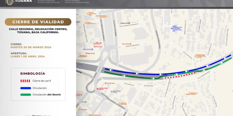 Tijuana, Baja California, a 24 de marzo de 2024.- El Ayuntamiento de Tijuana en su actividad de adecuación de vialidades, realizará una obra de reparación sobre la calle segunda a la altura del callejón Francisco Javier Mina, a partir de la colonia Soler hacia la zona centro, desde el martes 26 de marzo al lunes primero de abril.