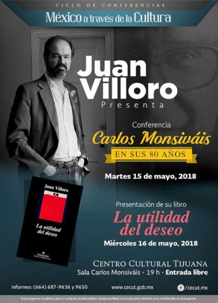 Tijuana, Baja California, mayo 12.- La conferencia Carlos Monsiváis, en sus 80 años y la presentación del libro La utilidad del deseo, serán actividades encabezadas por el escritor y periodista Juan Villoro, los días 15 y 16 de mayo, respectivamente, en el Centro Cultural Tijuana.