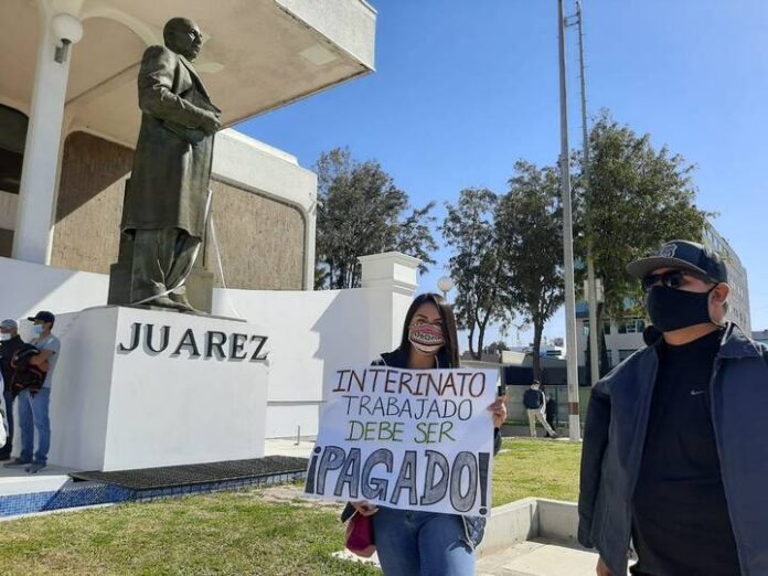 Tijuana,Baja California,26 febrero 2021/.- Maestros  realizaron una manifestación  en el centro de gobierno del estado en contra de la reforma a la ley Issste y rechazan que las pensiones del magisterio se paguen en Unidad de Medida y Actualización (UMA) y no con base al salario mínimo, como lo determinó la Suprema Corte de Justicia de la Nación(SCJN)