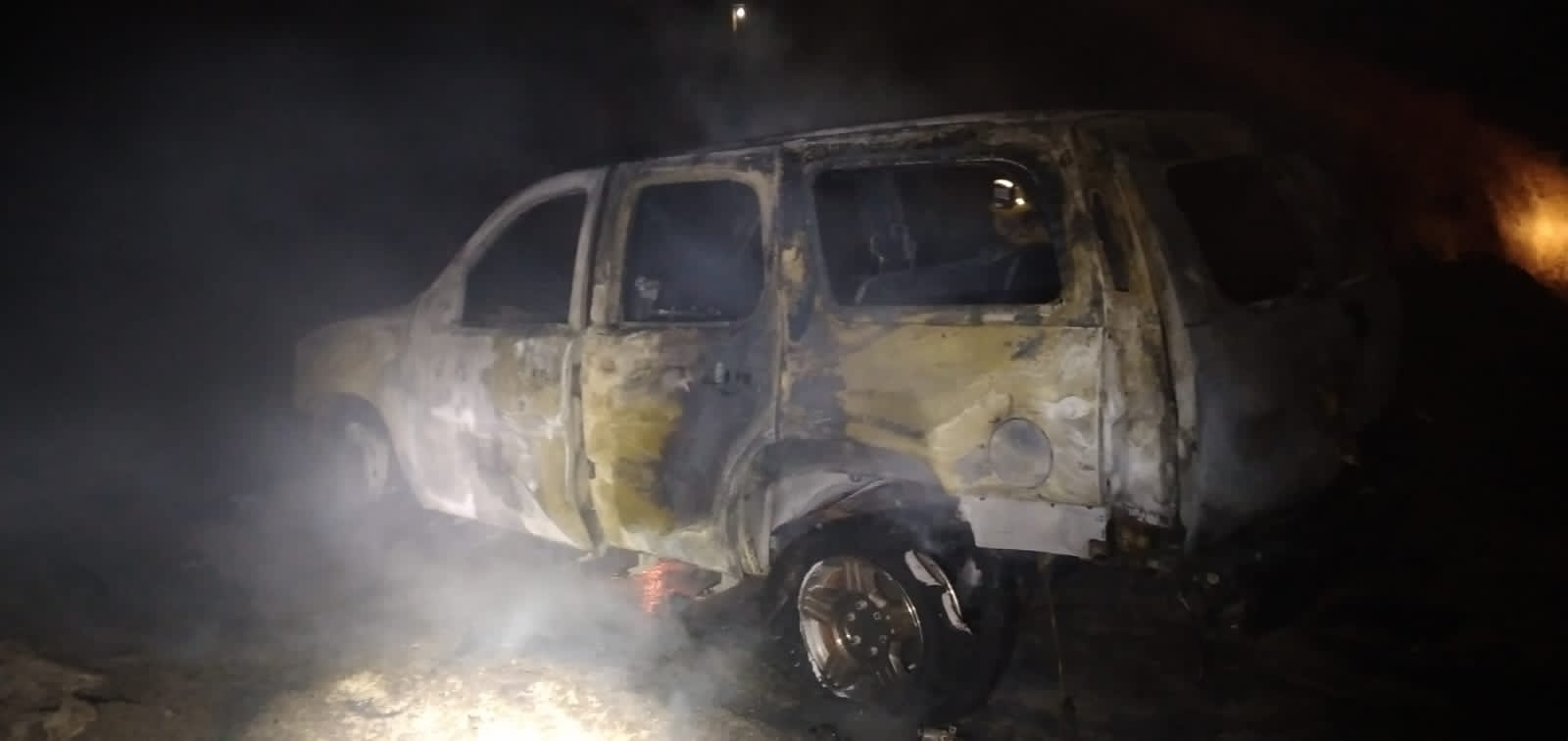 ENSENADA,BAJA CALIFORNIA,LUNES 15 agosto 202. Alrededor de las 20:30 horas de lunes, en una viliadad de terracería, en la calle Nayarit y Quintana Roo del ex Ejido Ruiz Cortinez, en Ensenada,Baja California, un sujeto incvendió unma camioneta.Bomberos de la estacioón Nortye apagaron el fuego,pero la unidad sufrió daños totales.