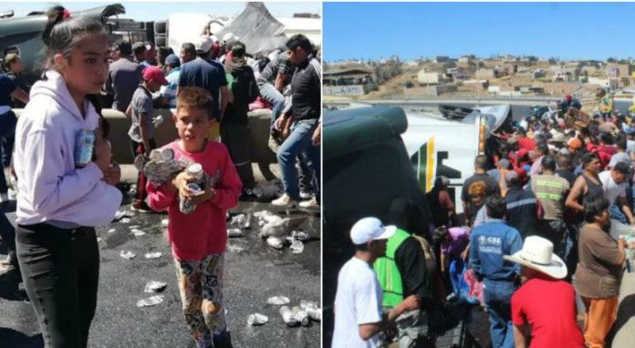 Policías Federales llegaron al lugar tras el accidente para evitar que los habitantes saquearan la unidad. Sin embargo llegaron a verse rebasados por la multitud que llegó a tomar estos artículos.