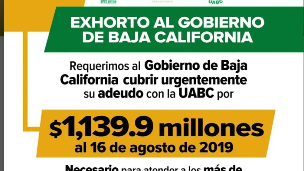 La Universidad Autónoma de Baja California (UABC) recibió por parte del Gobierno del Estado de Baja California, un cheque por un monto de 1,761,804,115 de pesos (un mil setecientos sesenta y un millones ochocientos cuatro mil ciento quince pesos), correspondiente al pago total de la deuda histórica generada en administraciones anteriores.