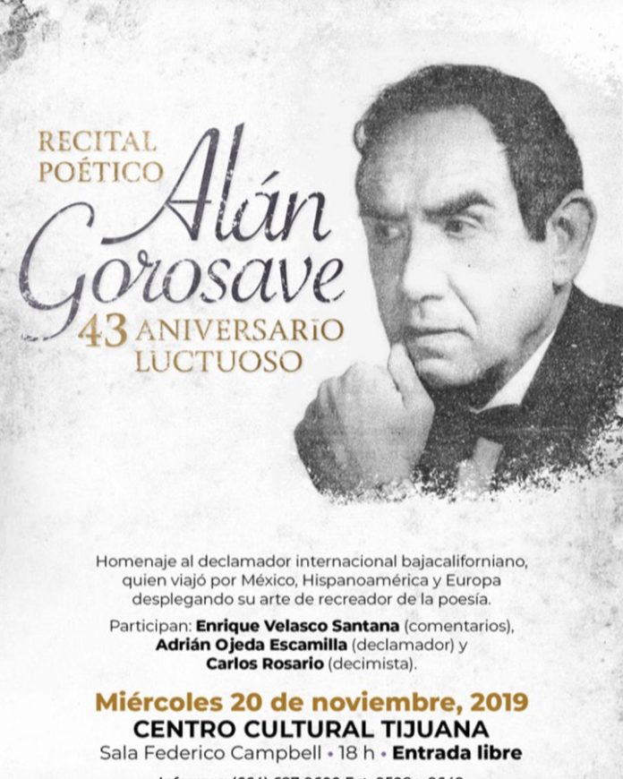 Recital poético: Alán Gorosave. 43 aniversario luctuoso Miércoles 20 de noviembre de 2019 Sala Federico Campbell • 18 h • Entrada libre