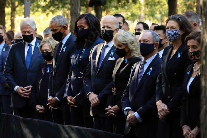 El presidente norteamericano, Joe Bieden, su esposa Jill y los ex mandatarios Barack Obama y Bill Clinton honran la memoria de las 2.977 víctimas de los ataques perpetrados por 19 terroristas en 2001