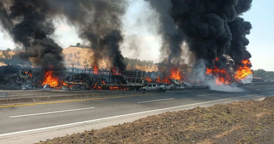 En el accidente registrado en el kilómetro 44 de la autopista Guadalajara-Tepatitlán,kilómetro 44 de la carretera Zapotitlán-Lagos de Moreno, participaron 16 vehículos: seis camionetas, cuatro compactos, cuatro tráileres, un torton y un camión de valores, sin embargo podrían ser más.Podría haber varios calcinados.