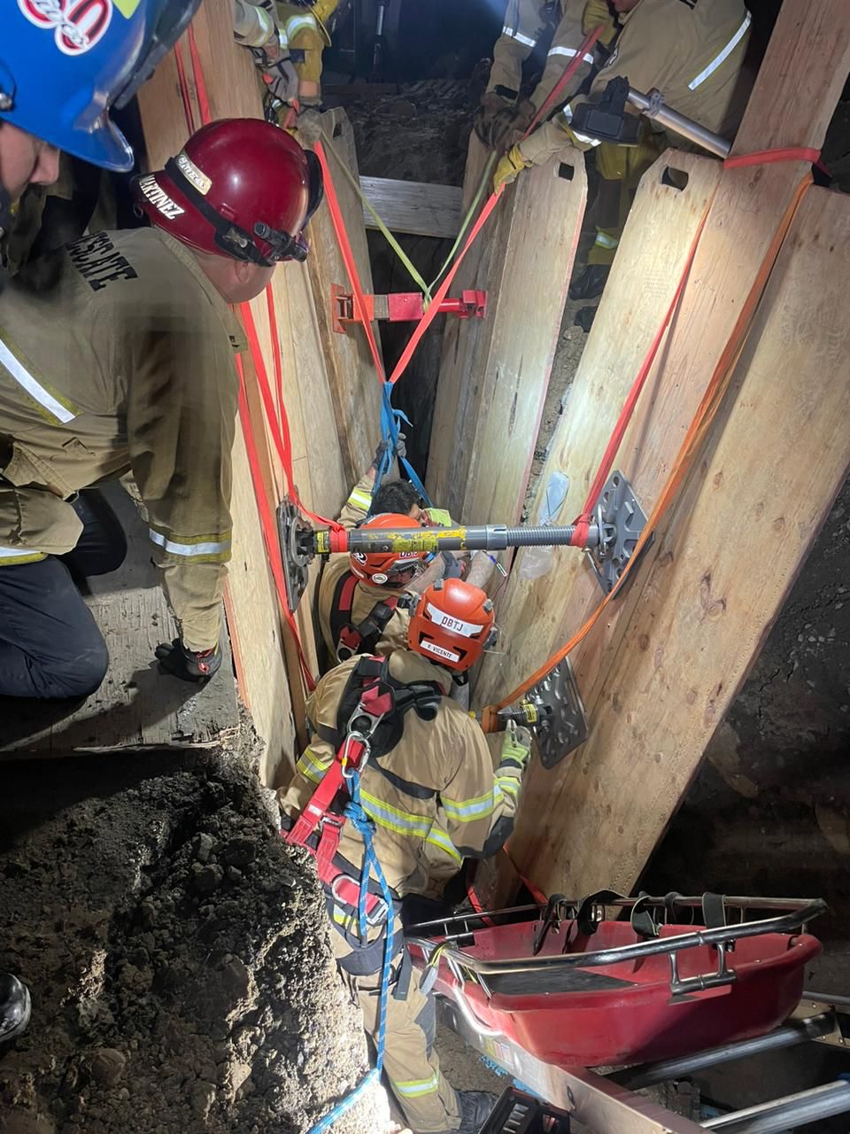En fraccionamiento Colinas del Rey bomberos rescata a hombre atrapado en zanja o trinchera. Fue liberado al filo de las 21 horas del lunes 19 DE FEBRERO 2024.