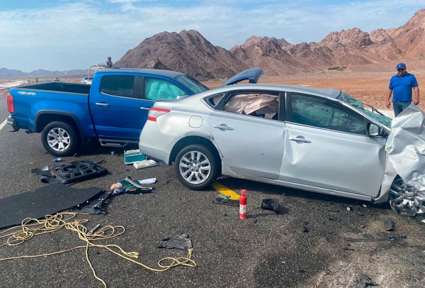 Terrible accidente de tránsito le costó la vida a cinco personas que viajaban en Nissan Sentra rumbo a San Felipe, cuatro personas de una familia que venían del puerto rumbo al Aeropuerto de Mexicali a bordo de un pick up, resultaron lesionadas, ambos vehículos quedaron sobre la carretera a la altura del kilómetro 102, aún jurisdicción de Mexicali.