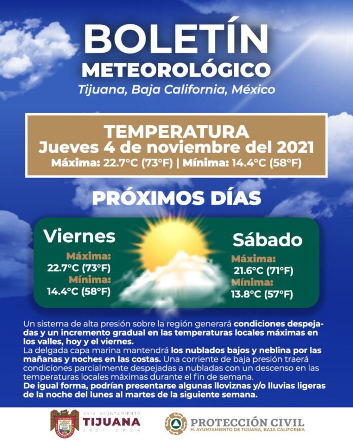 Un sistema de alta presión sobre la región generará condiciones despejadas y un incremento gradual en las temperaturas locales máximas en los valles, hoy y el viernes.