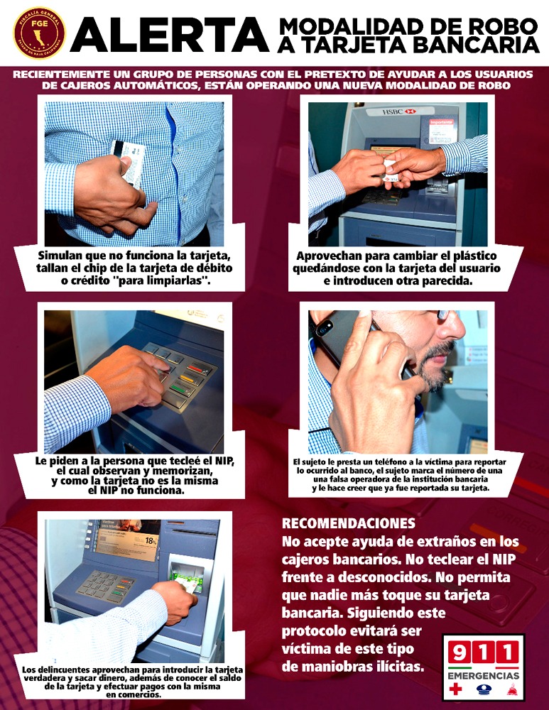 La FGE informa que estas bandas provenientes de Jalisco y la Ciudad de México andan al acecho, por lo que piden a la ciudadanía que tome sus precauciones y no permitan el auxilio de ningún desconocido mientras realicen retiros en cajeros.
