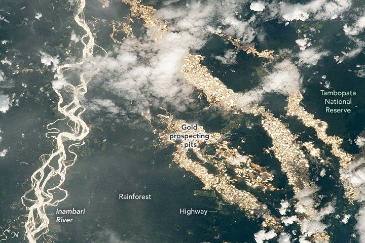 Según explicó la agencia espacial estadounidense, los «ríos de oro» capturados en las imágenes muestran los pozos que excavados para la minería ilegal, que aparecen como cientos de cuencas llenas de agua, donde se ha eliminado la vegetación, rodeadas de barro .