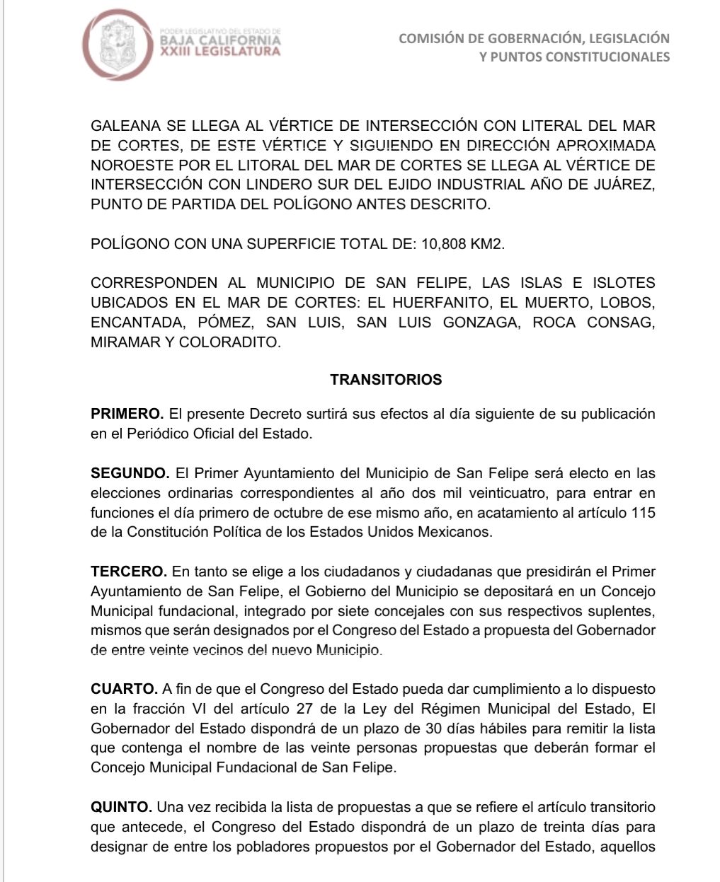 En la sesión extraordinaria de este día, la Comisión de Gobernación, Legislación y Puntos Constitucionales, que preside el legislador Juan Manuel Molina, quien actualmente está haciendo campaña para reelegirse por MORENA en el Distrito 05 que comprende el puerto de San Felipe, presentará en tribuna el dictamen 94 que decreta la municipalización de la delegación mexicalense, tan sólo a 15 meses de que esta misma legislatura creó el municipio de San Quintin.