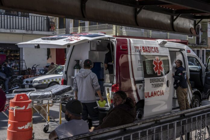 A las puertas del Ayuntamiento, dos ambulancias de Protección Civil esperan desde el amanecer una llamada. Una pareja de paramédicos desinfecta uno de los vehículos que ha funcionado estos meses como el único transporte para la población entre este pueblo y hospitales disponibles. La ambulancia por dentro está prácticamente vacía: solo una camilla y un botiquín de primeros auxilios. “No tenemos capacidad para nada más. Intentamos que el traslado sea lo más rápido posible. Pero los hospitales de la zona están saturados, llamamos antes de ir para no estar esperando. A veces los familiares se encargan de enviar a su enfermo con un tanque de oxígeno. Nosotros solo podemos facilitar el viaje”, cuenta Dania Ruiz, una de los paramédicos.