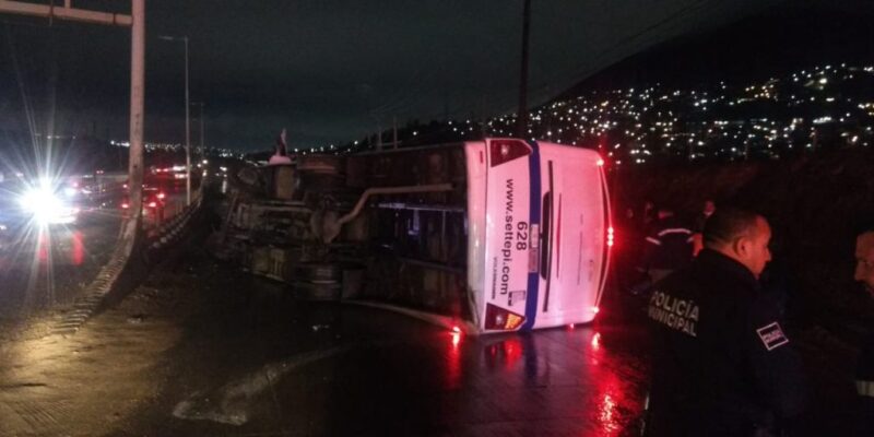 Un camión de la empresas Settepi que transportaba a 50 empleados de la fábrica Samsung se volcó la tarde de este martes en el bulevar El Florido frente al fraccionamiento Lomas Virreyes.