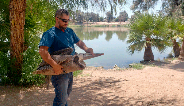Como sucedió hace un año por estos meses en el que el termómetro en Mexicali marca temperaturas por arriba de los 40º grados centígrados, un pelícano que sobrevolaba la ciudad sufrió golpe de calor y cayó en una colonias donde ciudadanos lo llevaron a las instalaciones del Bosque de la Ciudad para su resguardo y atención.