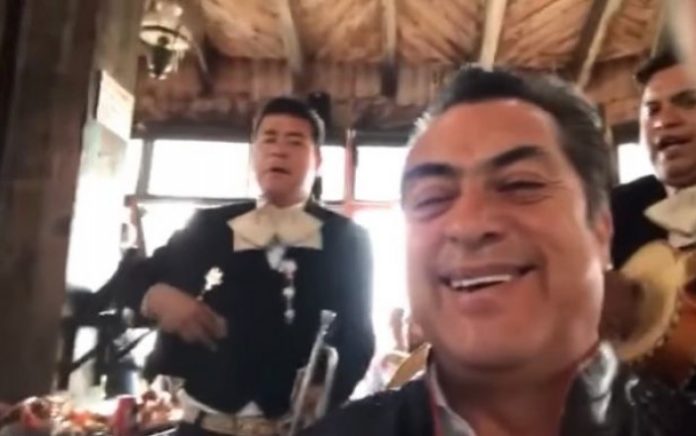 En el video los músicos dicen llamarse «Mariachi Estrella», mientras se encamina a la mesa del gobernador con licencia de Nuevo León.