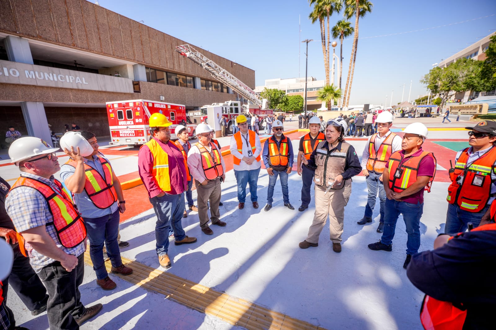 Personal de Protección Civil de Mexicali activó los protocolos para evacuar el edificio del Palacio Municipal y trasladar al personal y ciudadanos a los puntos de reunión.