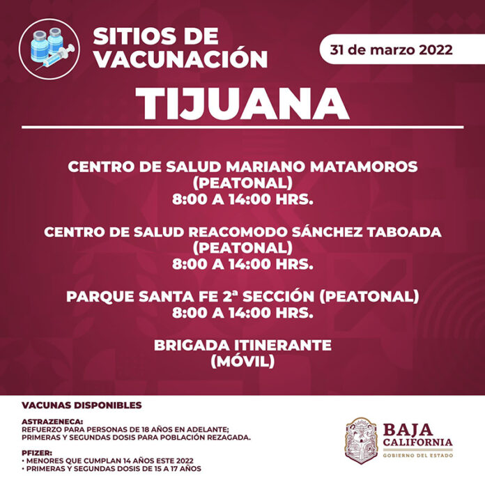 La Secretaría de Salud de Baja California dio a conocer que este jueves continúan las jornadas de inmunización contra el Covid-19 en los distintos puntos de nuestra entidad, por lo que piden a la ciudadanía ubicar el sitio de vacunación que le quede más cercano.