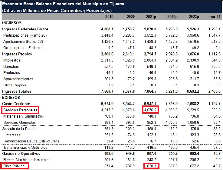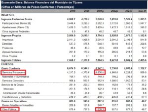 En ese sentido, la calificadora indica que Tijuana tendrá egresos por 7 mil 865.8 millones de pesos durante el presente año, de los cuales los servicios personales se llevarán 4 mil 676.5 millones de pesos, un aumento del 7% para 2021 respecto a los destinado en 2020.