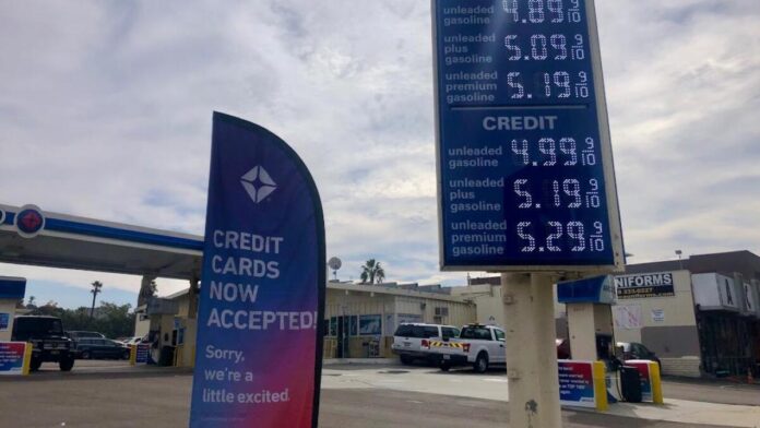 El precio medio del galón de gasolina normal en el área de San Diego superó la marca de los 5 dólares por primera vez en la mañana del viernes, alcanzando los 5.10 dólares, según AAA, después de un espectacular aumento de 12.9 centavos en un solo día.
