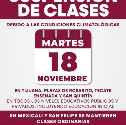 Suspenden clases escolares el 18 de noviembre por lluvias.En Tijuana,Playas de Rosarito, Tecate y Ensenada