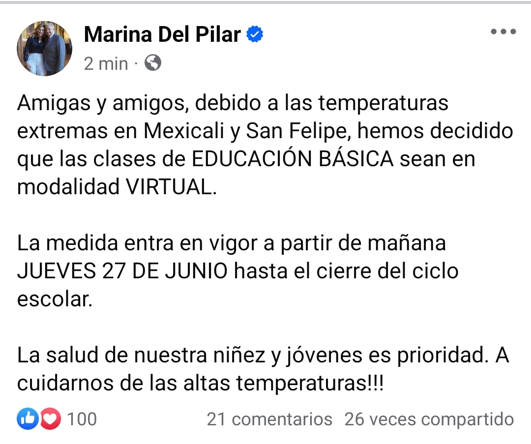 Debido a las altas temperaturas que se registran en Mexicali y San Felipe, las dos últimas semanas de clase en educación básica se llevarán a cabo en modo virtual, por lo que se suspenden las clases presenciales en las aulas de mil 136 escuelas de la capital del Estado, el Valle y el puerto de San Felipe.