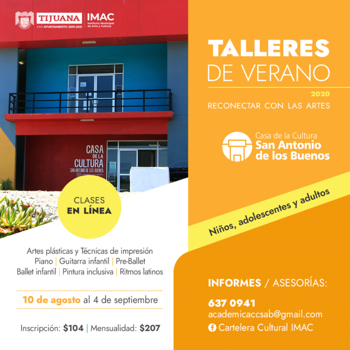 Del 10 de agosto al 5 de septiembre, la Casa de la Cultura de Tijuana ofrecerá capacitaciones en artes plásticas, teatro, teatro infantil, violín, guitarra, guitarra acústica, canto, danza folclórica, serigrafía y grabado, a un costo mensual único de 362 pesos y 124 pesos de inscripción, informó la directora del IMAC.