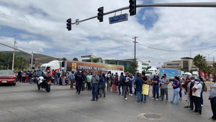 Mexicali,BAJA CALIFOR NIA, 06 JUNIO 2020/- Un grupo de 100 trabajadores de maquiladoras del puerto de Ensenada protestaron por ausencia de pagos de salarios a grupos vulnerables durante la fase crítica del coronavirus, sobre todo de embarazadas y lactantes, y acusaron al gobernador Jaime Bonilla de estar en favor de las empresas de la manufactura de exportación.